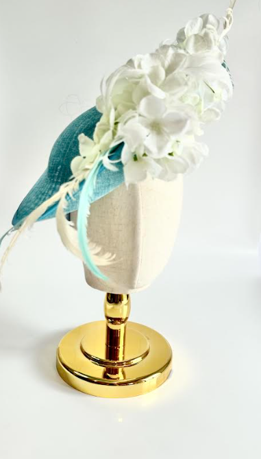 Inspired by the serenity of the sky and sea, Azure is a graceful fascinator in a stunning blue hue, adorned with soft white florals and delicate feathers. A perfect statement piece for weddings, race days, and elegant garden parties.