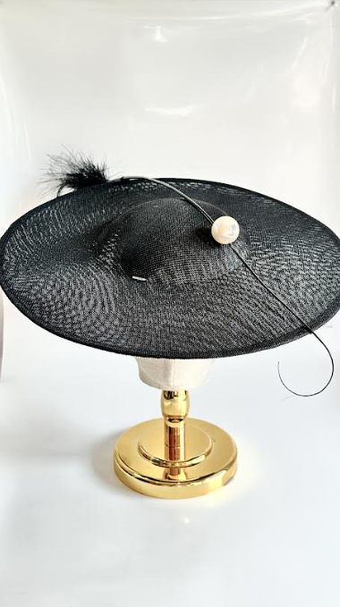 A tribute to quiet luxury. Crafted from fine sinamay into a wide-brimmed silhouette, this hat floats with understated elegance. A single pearl — suspended delicately on a wire arc — evokes a drop of morning light or a tear of moonlight, while the soft feather flourish whispers grace. Designed for women who speak volumes with simplicity.