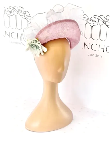 Blush pink bandeau with soft blue organza ruffles and a white bloom—light, airy, and effortlessly graceful.