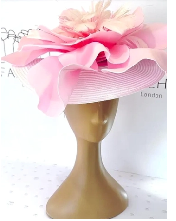 Pink straw hat with sculpted petals and a white feather flower centre—floral fantasy in full bloom.
