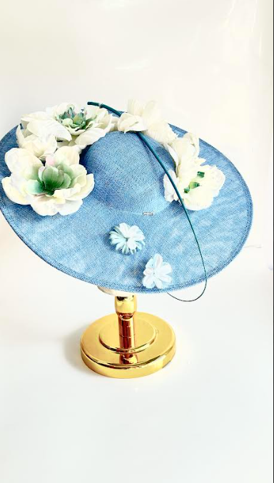 A breathtaking wide-brim hat in oceanic blue, Marina is adorned with delicate white florals and elegant feather details, perfect for weddings, race days, and summer soirées.