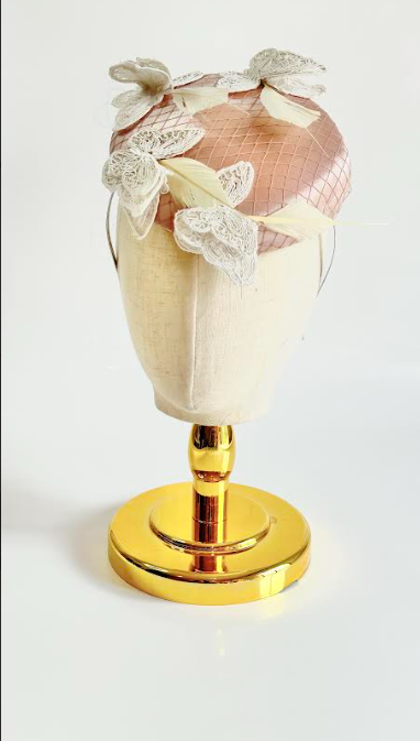 Inspired by the delicate beauty of butterflies, Papillon is a blush pink fascinator adorned with intricate lace butterflies and soft ivory feathers. A timeless piece for weddings, tea parties, and elegant race days.