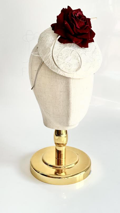 Timeless and romantic, Rosewood is an ivory lace-covered pillbox hat adorned with a deep red velvet rose, exuding classic elegance. Perfect for weddings, tea parties, and sophisticated occasions.