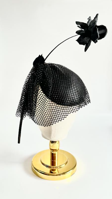 Nuit Rose is a midnight bloom — a celebration of shadows and softness. A cluster of hand-crafted black roses rests gently on a classic pillbox base, accented with veiling and sculpted feathers. It’s mysterious yet feminine, like a whispered secret in a moonlit ballroom